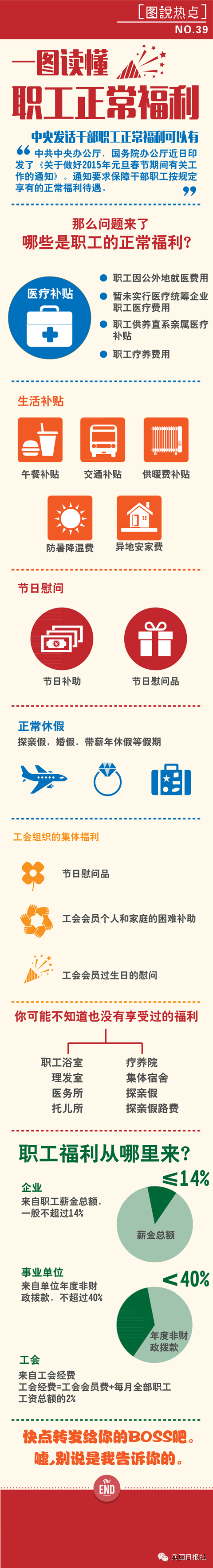 中共中央辦公廳、國務院辦公廳近日印發了《關于做好2015年元旦春節期間有關工作的通知》。通知要求保障干部職工按規定享有的正常福利待遇。那些是職工享有的正常福利呢?由下圖看清你的福利:
