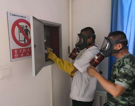 演練中,值班人員發現危險化學品泄漏后馬上報告給部門領導,并立即啟動哈密水務公司二氧化氯泄漏應急處置預案,迅速組織人員按照預案處置程序采取措施:公司維修人員根據指令全部穿戴好防毒護具,做好停電措施并關閉加藥設備、開啟通風設施進行搶修,同時對泄漏地面的藥品進行稀釋沖洗,整個處置過程緊密配合、銜接有序。