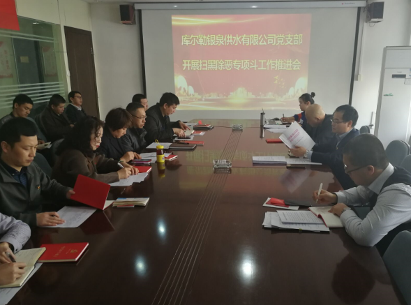為深入貫徹黨的十九大部署和習近平總書記重要指示精神,切實增強“四個意識”,全面響應中央、自治區、自治州、市關于掃黑除惡專項斗爭工作的統一部署,開展好城市供水行業掃黑除惡專項斗爭,2019年2月26日下午,庫爾勒銀泉供水有限公司黨支部召開掃黑除惡專項斗爭工作推進會,對公司掃黑除惡專項斗爭工作做了安排和進一步推動。