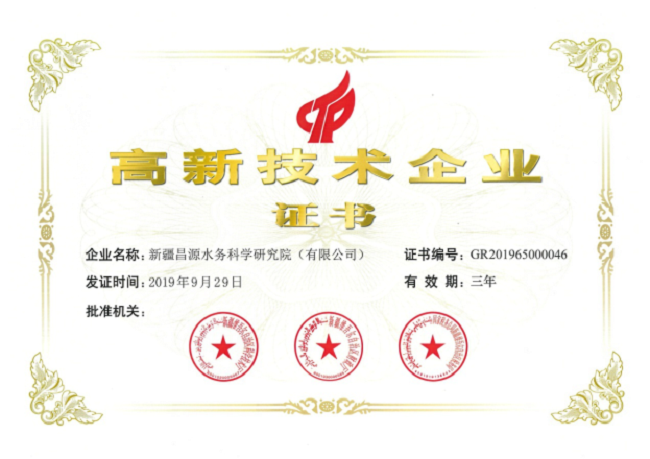 2019年9月29日,新疆昌源水務科學研究院順利通過高新技術企業認定(2019年12月19日取得證書),獲得自治區科技廳、財政廳和稅務局聯合頒發的“高新技術企業證書”。